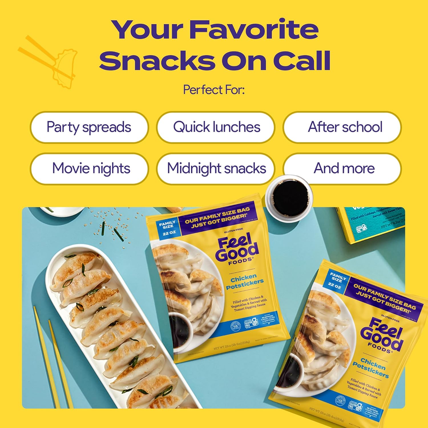 Certified Gluten-Free Potstickers – Skip take-out & open your freezer instead! This party size pack of succulent chicken potstickers is made with better-for-you ingredients & makes a delicious sharing appetizer