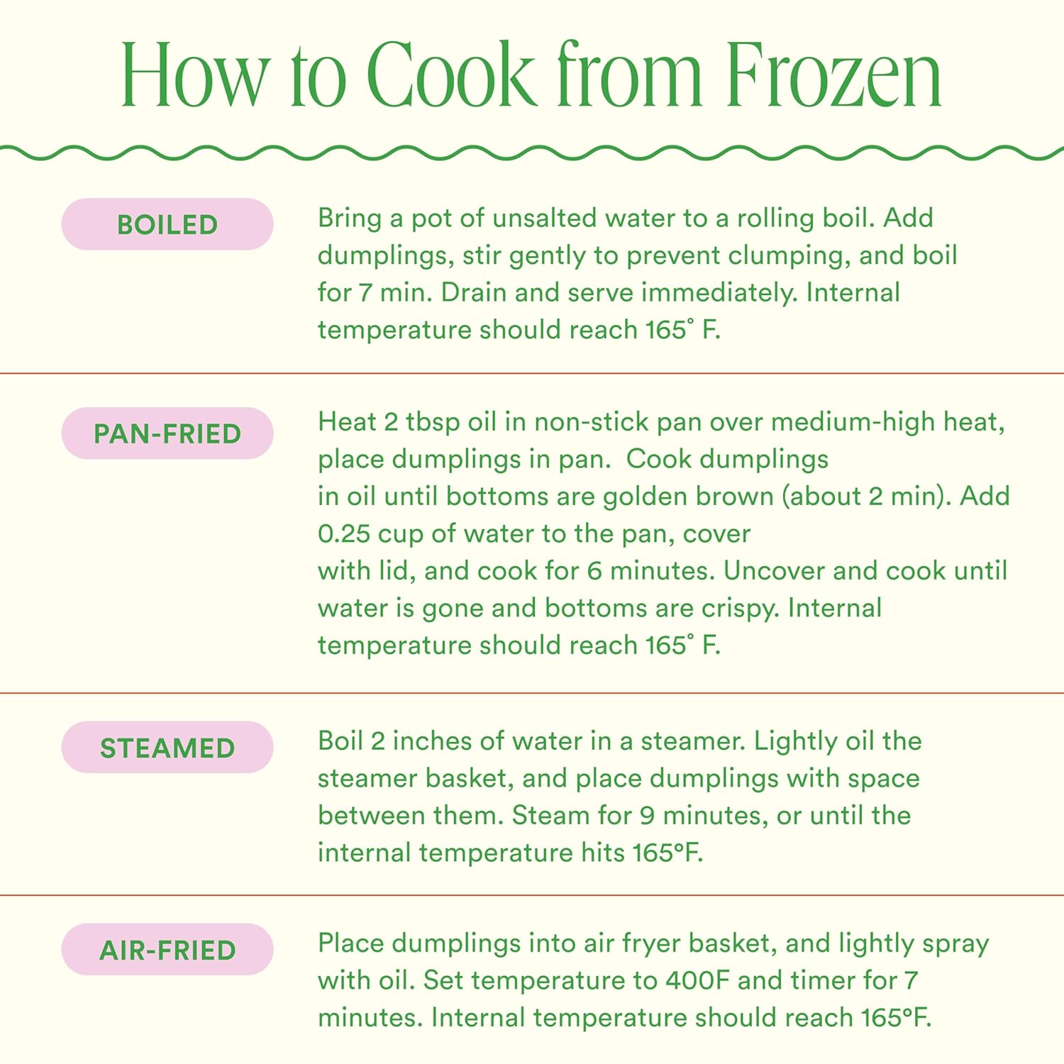 Frozen Fresh & Safe to Store — Keep Mimi’s dumplings frozen. Cook thoroughly to 165°F and refrigerate leftovers immediately. Do not refreeze once thawed for best taste and safety.