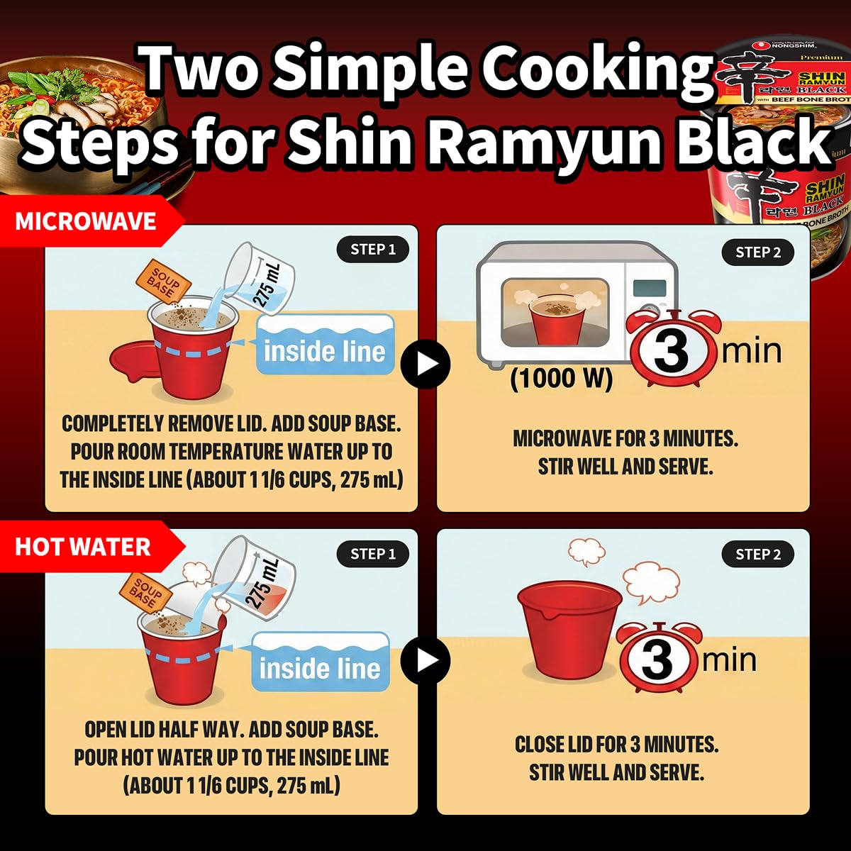 Instant Comfort, Always Ready: Ready in minutes using either the microwave or hot water, Shin Ramyun Black is perfect for busy nights or late cravings. Microwaveable cup makes prep and cleanup a breeze a must-have pantry staple that delivers warm, spicy satisfaction fast and fuss-free.