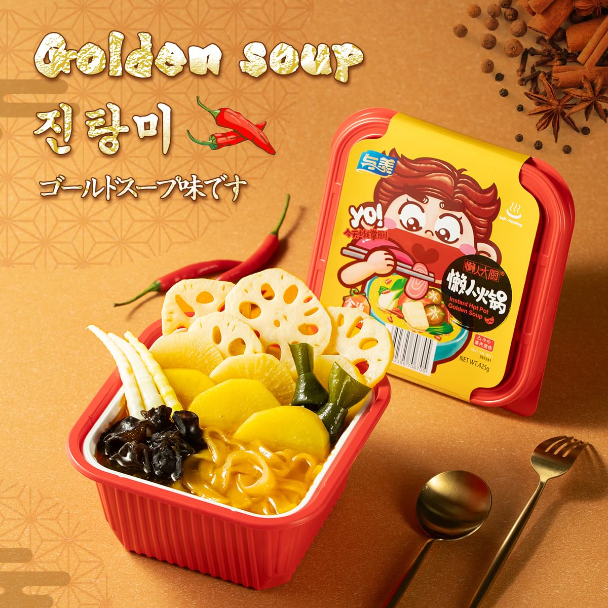 / Yumei Instant Hotpot Self-Heating 425g, with Vegetables and Noodles in, Golden Soup Flavor Pack of 3 (Golden Soup)
